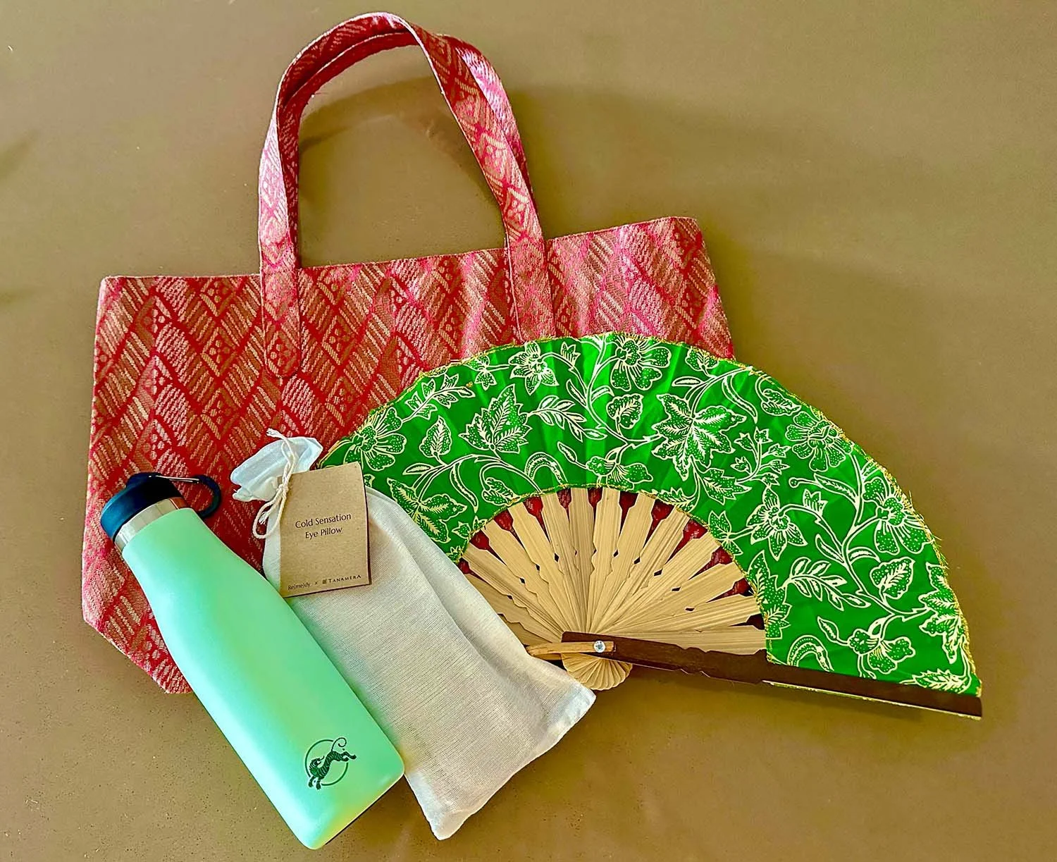 Instead of a chocolate on our bed each night, there was a practical gift: a stainless-steel monogrammed water bottle, a functional decorative fan, a carry bag made from the train’s old soft furnishing fabrics and a lavender eye pack.