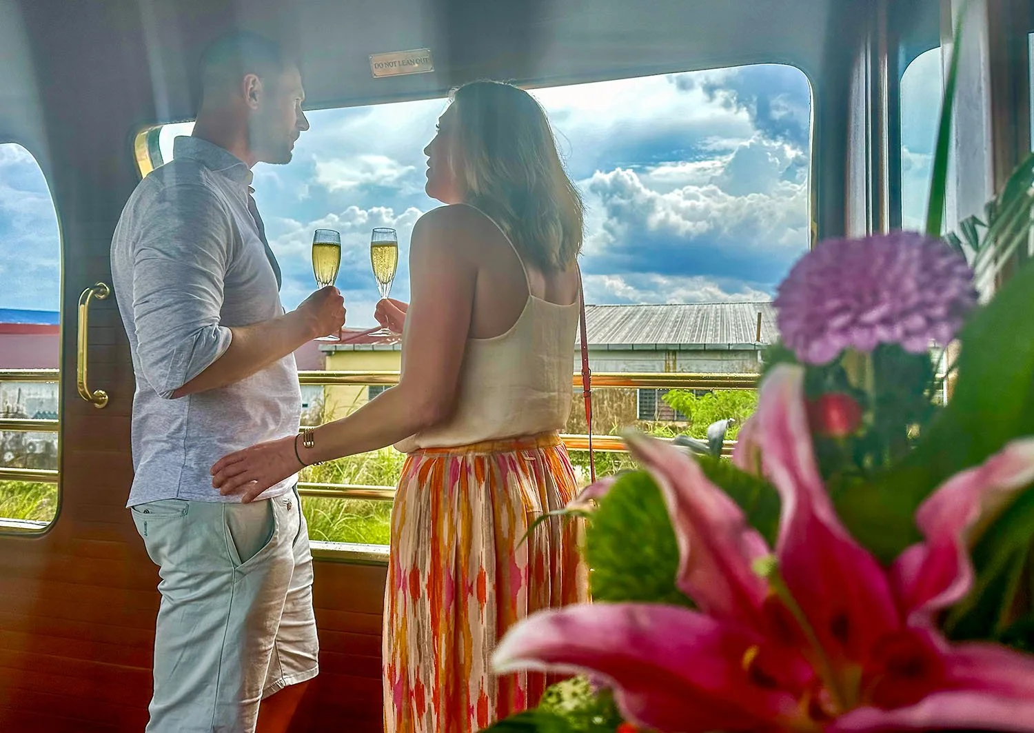 Dainty tropical fruit bowls, bite-size melting-moment chocolate cups, and slithers of sweet caramel tart are tastefully arranged on a two-tier platter. Champagnes are poured, and we toast to the bespoke journey as a wandering magician entertains each table with slick card tricks.